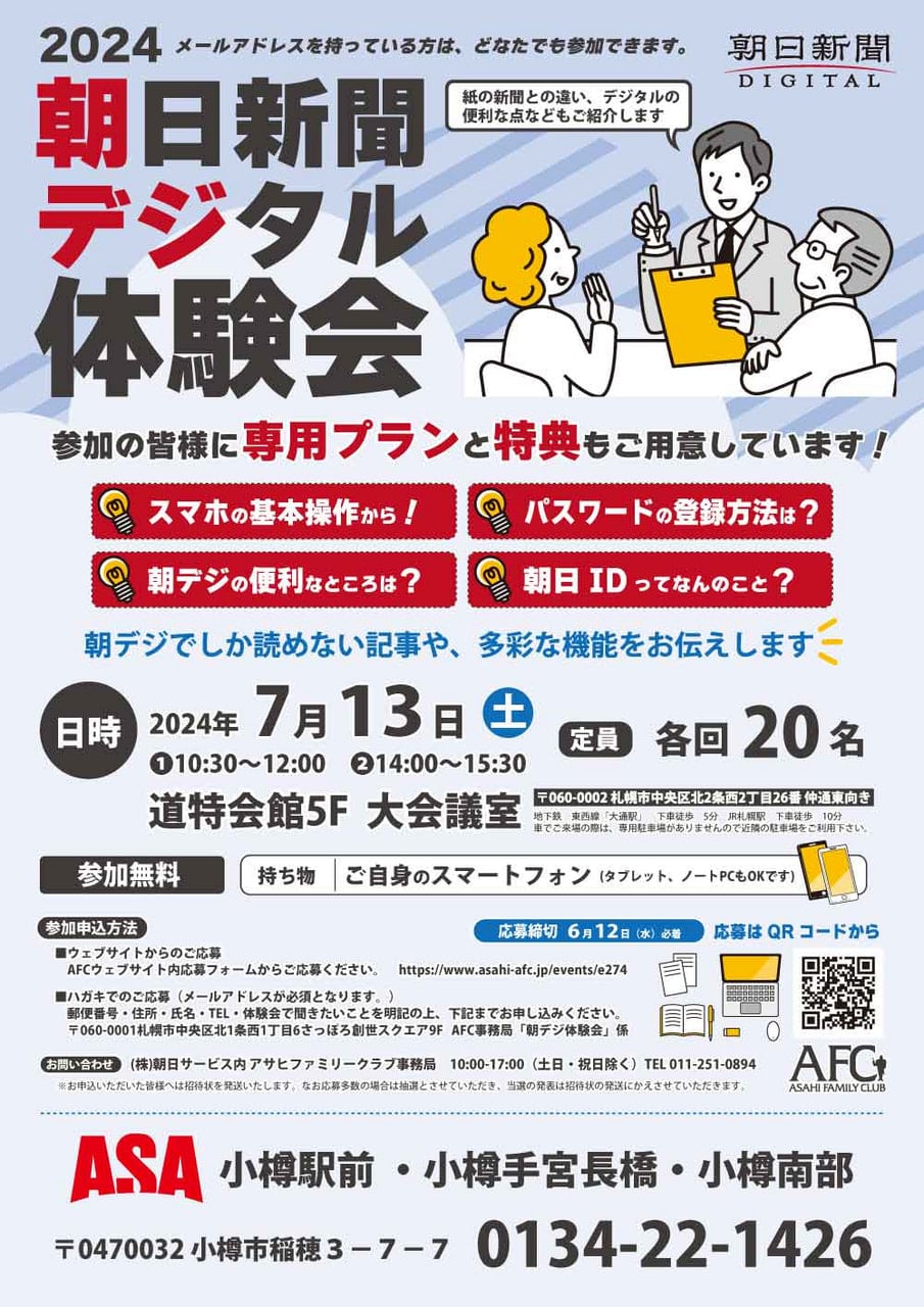 朝日新聞デジタル体験会 2024.07.13 朝日新聞デジタル体験会を2024年7月13日(土)に開催いたします。朝日新聞デジタルのコンテンツ紹介をはじめ、読者の皆さんの様々な悩みにご対応いたします。 イベントへ戻る