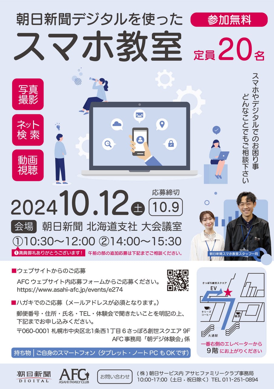 朝日新聞デジタルを使ったスマホ教室 2024.10.12 朝日新聞デジタルの体験会を実施します。今回はスマートフォンの基本操作からデジタルまつわる不安や不明点を解決していただきます。ぜひお越しください。 イベントへ戻る